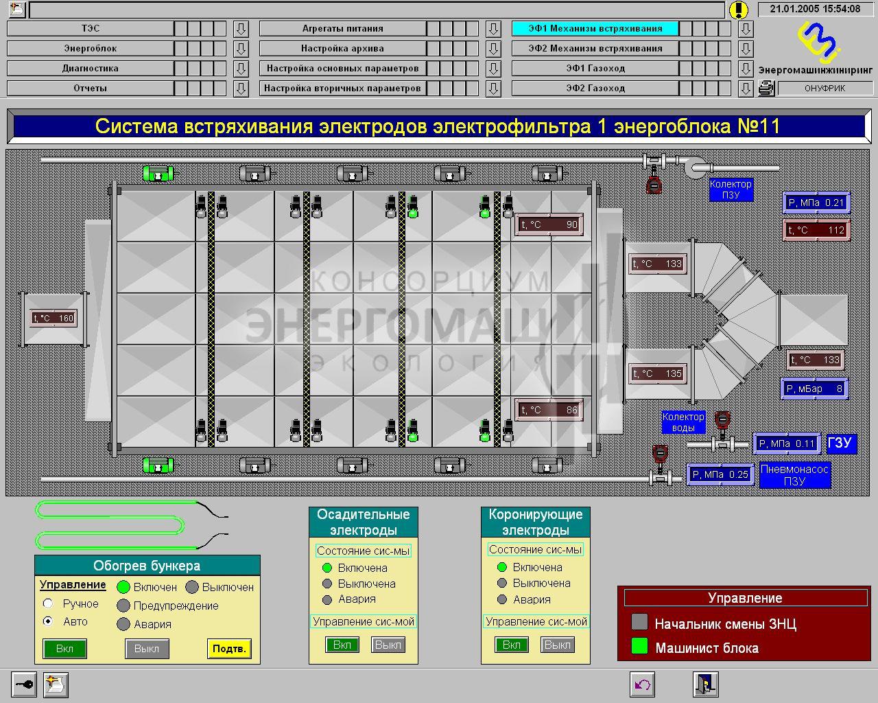 Для управления электрофильтрами разработана система АСУ ТП, которая отображает актуальную картину происходящих процессов и позволяет дистанционно в режиме реального времени управлять механизмами газоочистного оборудования с рабочего места оператора. Программно–технический комплекс системы управления выполнен на базе программируемых контроллеров ведущего мирового производителя «Siemens».